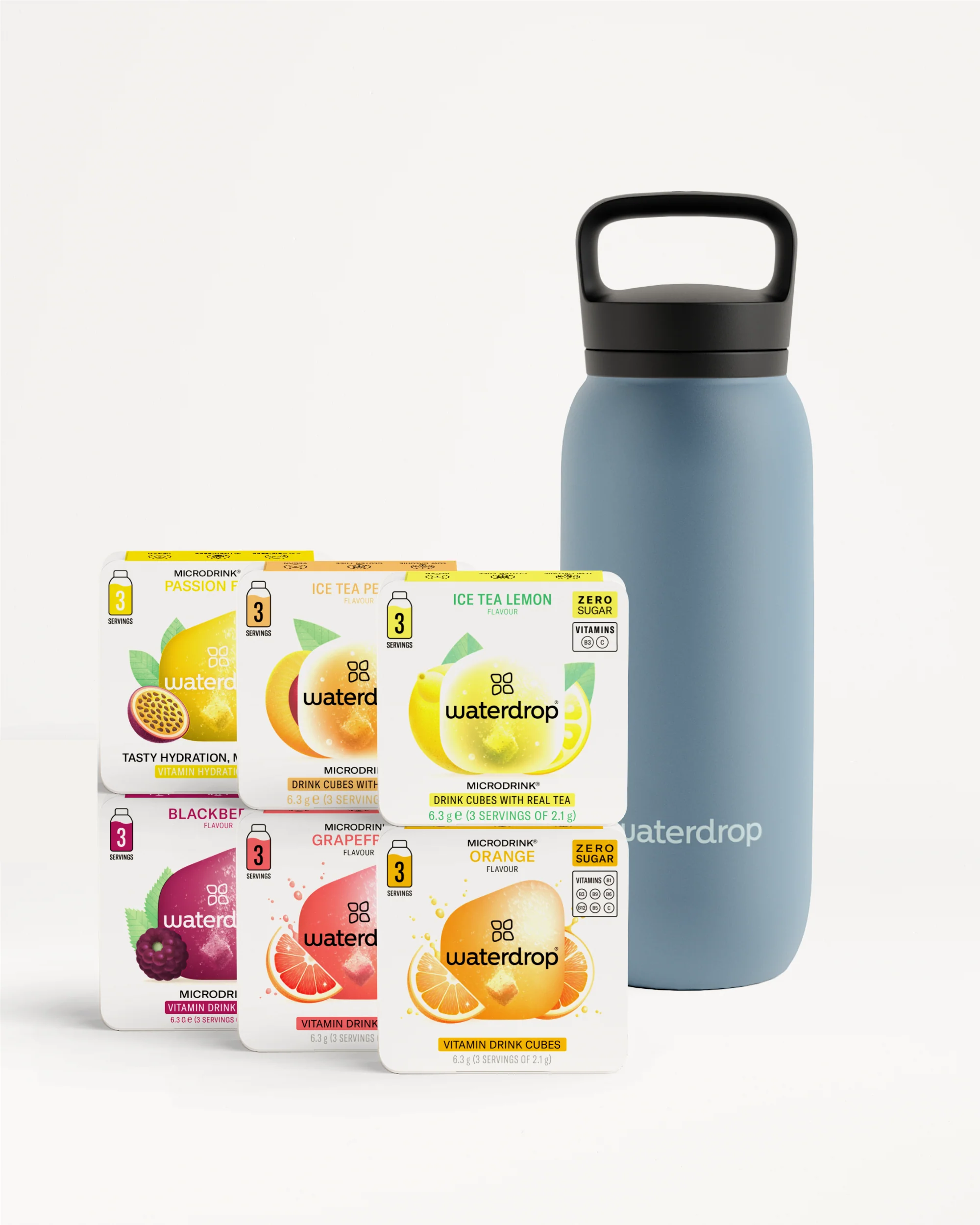 Find your favourite with our set of 6 Microdrink flavours in convenient 3-Packs, including one of our high-quality Stainless Steel All Purpose Bottles (600ml) with Spout Lid in a colour of your choice!